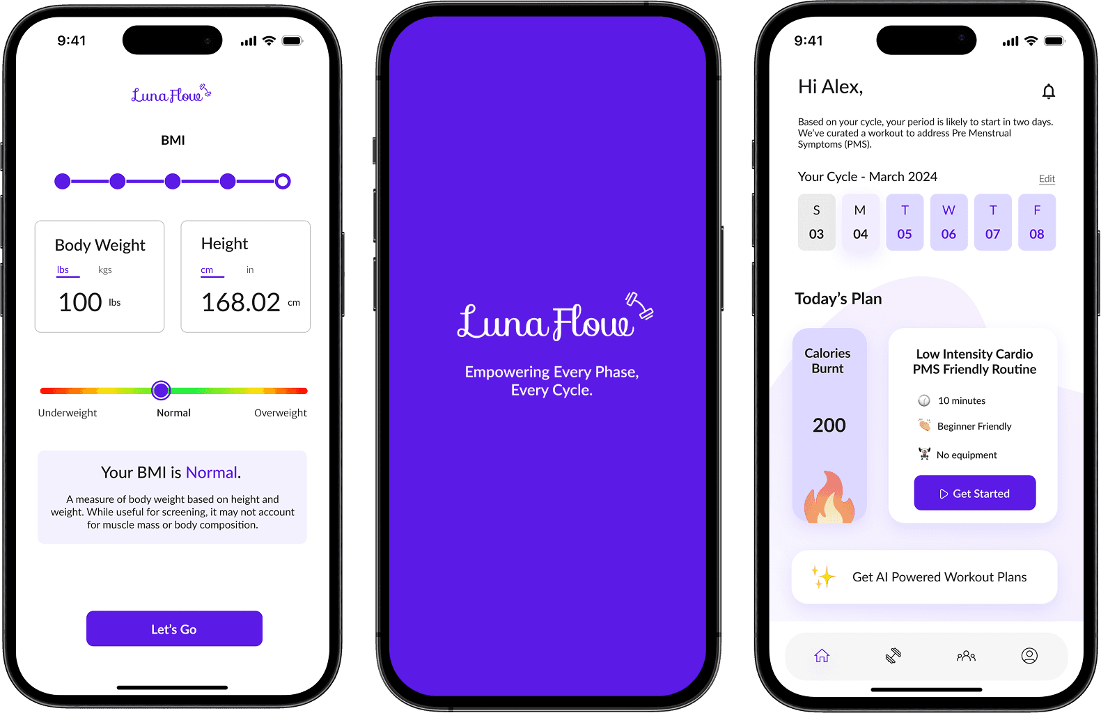 A wellness app supporting menstruating individuals with personalized exercise routines and wellness tips aligned to their cycle.