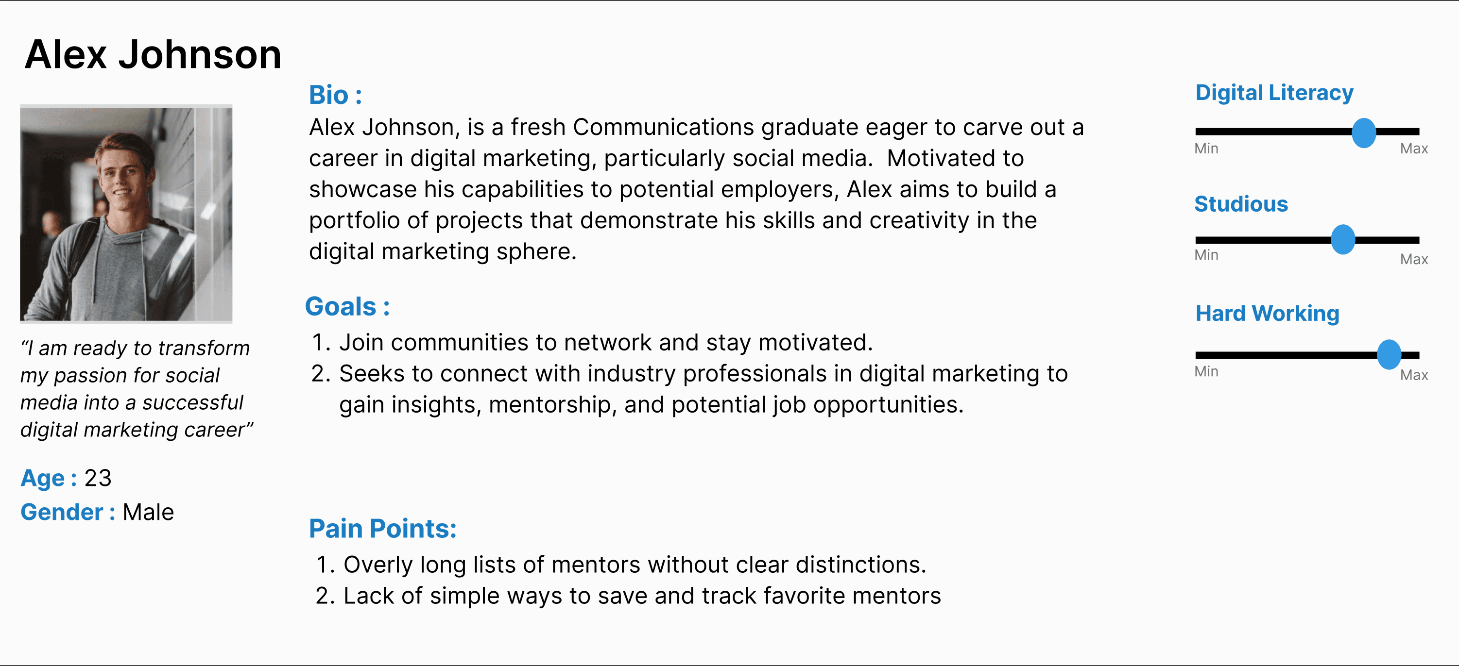As a recent graduate with no formal mentorship experience, I want an intuitive app that recommends mentors based on my interests and goals, and feels engaging and interactive, so that I feel supported and motivated to start my career journey.