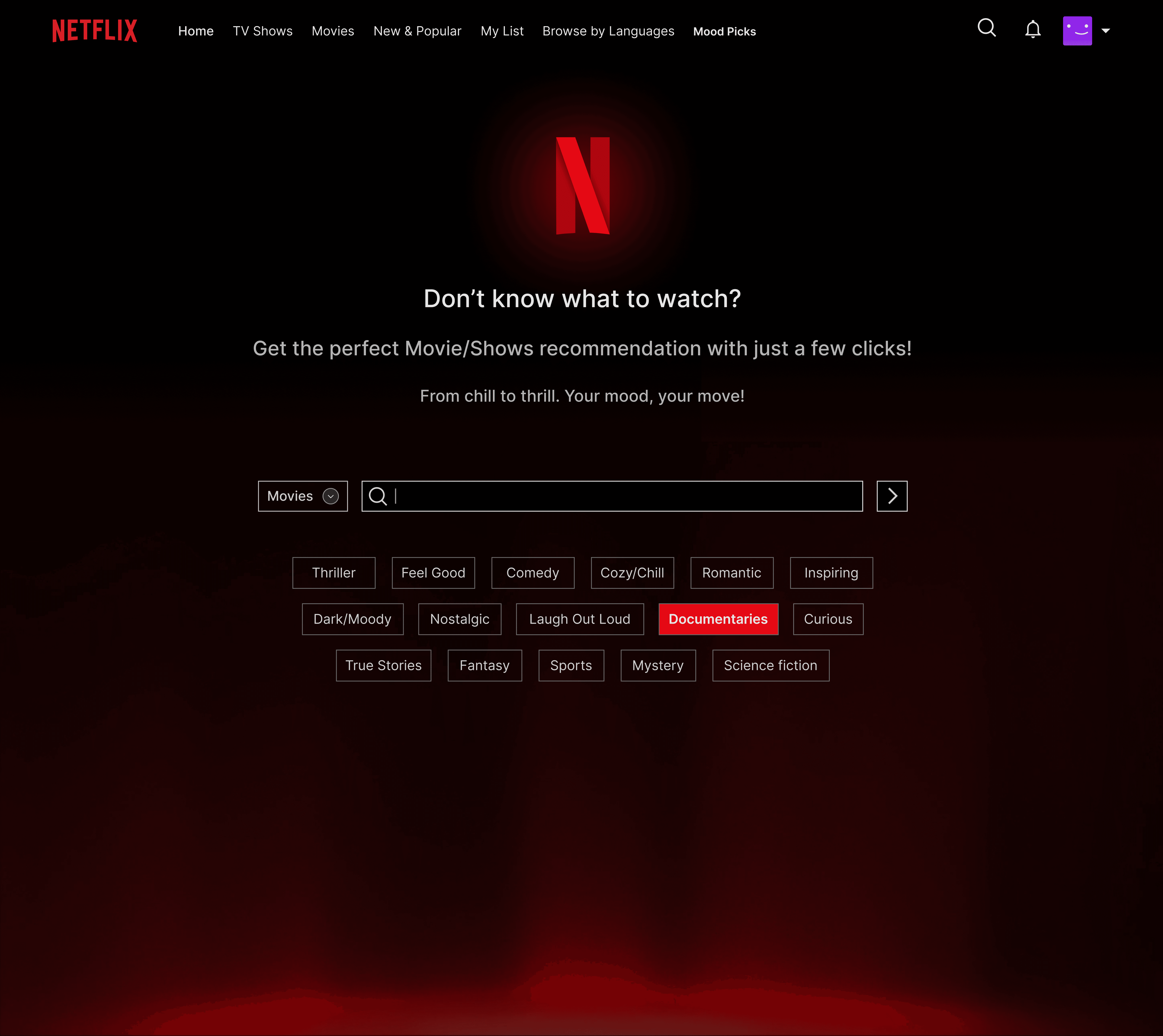 The users can choose the tags they like or type in what they want to watch. Users can also choose between Movies/TV Shows.