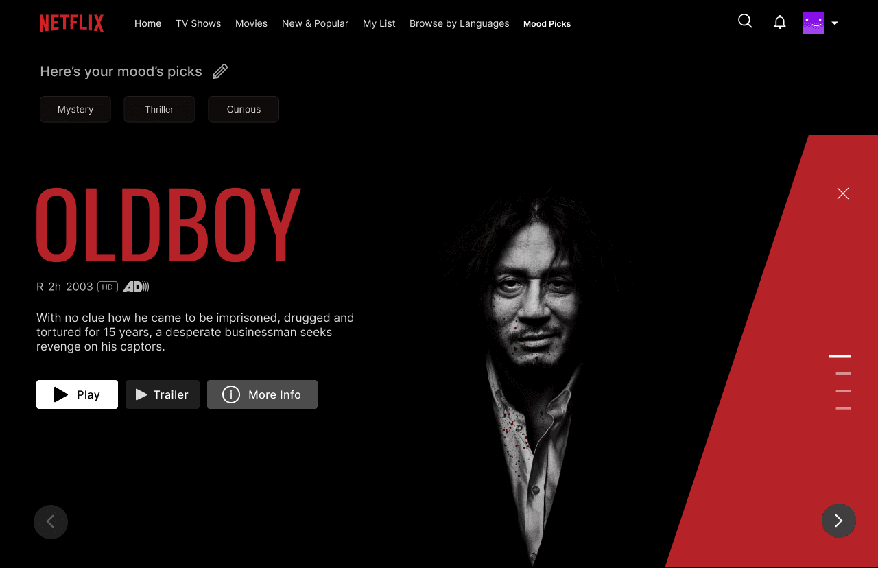Displays a curated title (e.g., Oldboy) with quick options: Play Now, More Info, or Try Another.
