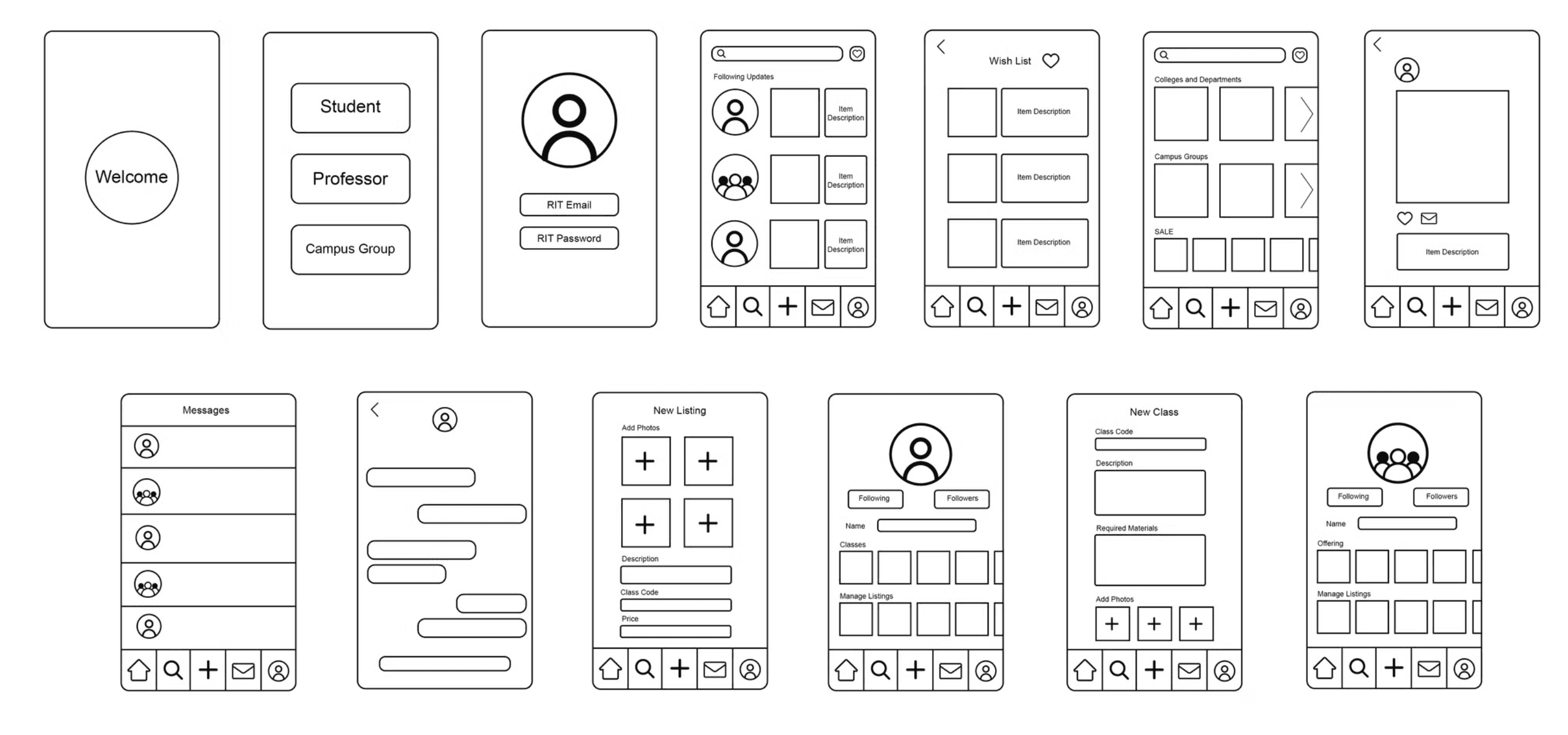 We began the prototyping process with a workflow chart for the application. The app would be navigated and used differently based on the three types of stakeholders: students, professors and campus groups.