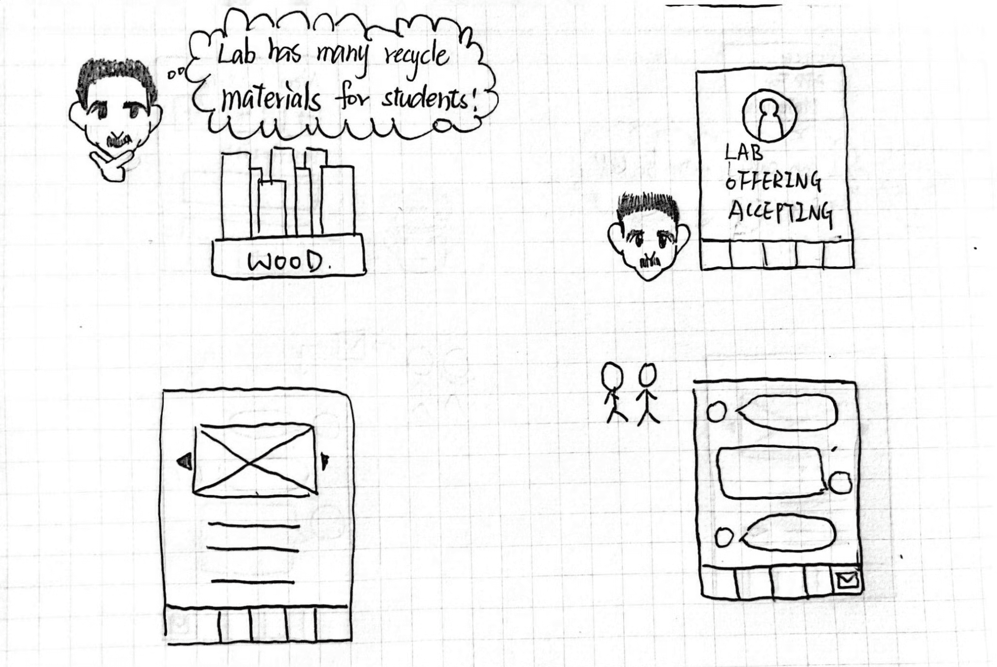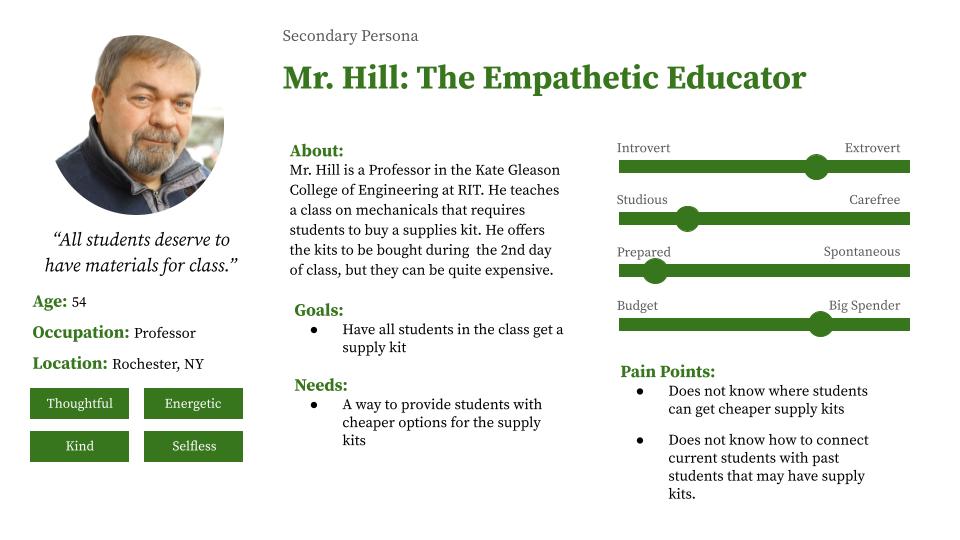 Our secondary personas include a professor and a lab manager. The professor would like to find materials for all students in his class, and the lab manager is an active recycler who would like to encourage students to also recycle and reuse.