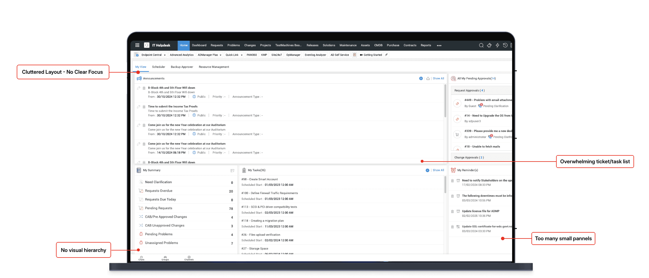 Feature Preservation: Core ServiceDesk Plus functionality (Requests, CAB Approvals, Announcements, Problems) had to remain intact; the redesign focused on usability, not feature removal.